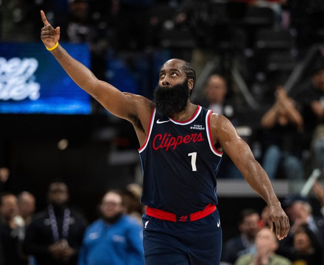 次节哈登从地上捡起来球立马三分出手都命中,单节哈登又命中三记三分球,第二节6分钟里连拿12分,上半场打完哈登8中7+三分5中5+罚球7中7拿到26分,在哈登的带领下快船大比分领先太阳。