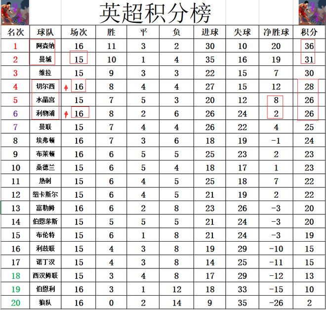 积分榜方面,阿森纳惊险绝杀赢球后,先赛的他们暂时将和曼城的分差拉大到5分。切尔西和利物浦今天齐齐赢球,切尔西暂时超过水晶宫冲回前4,利物浦则是超过曼联1分升至第6。